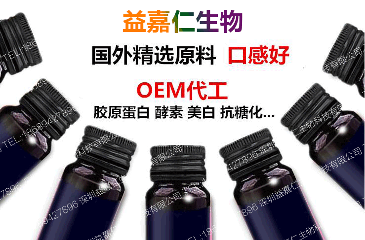 大豆肽饮品OEM代工,大豆肽胶原蛋白果汁饮品贴牌加工,小分子肽饮品加工,大豆低聚肽饮品加工,玉米肽解酒饮料加工,姜黄素解酒饮品OEM,蓝莓叶黄素酯饮品加工,燕窝玫瑰饮品代加工,新资源健康美容饮品代加工--从策划、设计、研发、采购、生产、出货、品牌营销每一个环节均由本公司一站式精心打造!深圳益嘉仁生物采用一千级无菌车间,产品生产环境达制药标准,同时避免出现水中的重金属、细菌含量超标情况,所有生产用水均为自主生产的纯净水,从根源确保产品的安全!